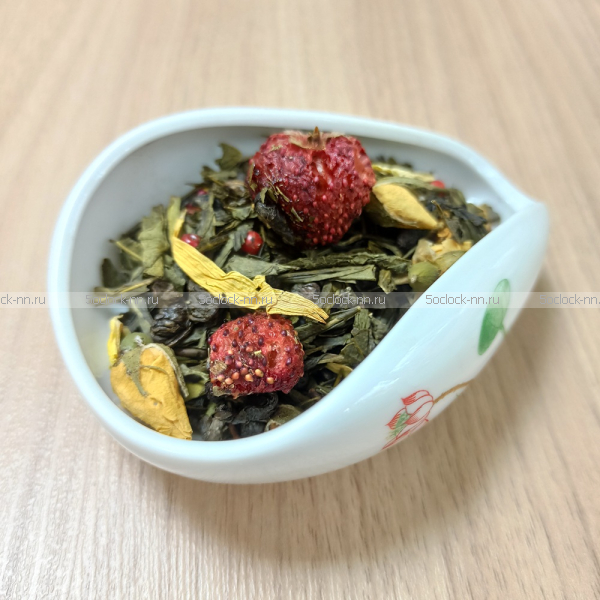 Ароматизированный чай со вкусом клубники, цветочной нотой розы и терпкой перечной ноткой. Бодрит, согревает.