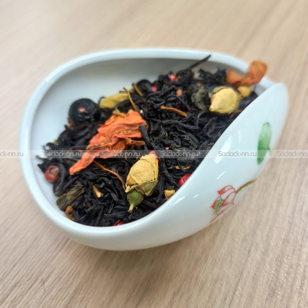 Состав: черный индийский чай, черный цейлонский чай, китайский чай Зеленая Улитка, ягоды черной смородины, бутоны жёлтых роз, перец розовый и чёрный, цветы лилии.