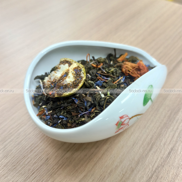 Состав: зеленый улун, китайский чай Зеленая улитка, черный индийский чай Дарджилинг, японский чай Ходжича, кумкват, цветы лилии, василёк.